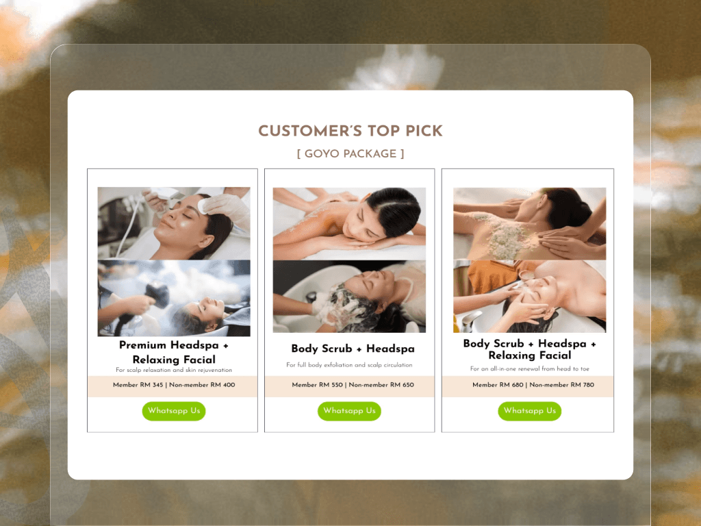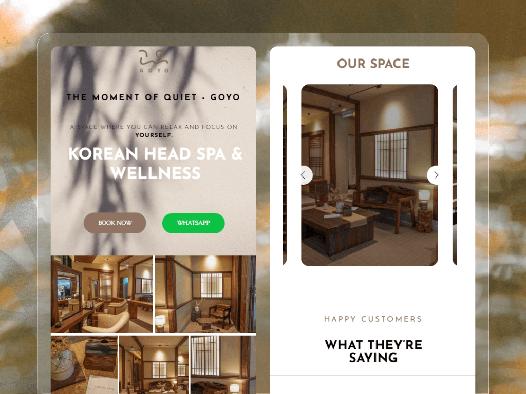 Head Spa by GOYO is a luxury Korean head spa and wellness website designed to communicate calm, privacy, and premium care. The goal of the project was to create an immersive digital experience that mirrors the brand’s tranquil in-spa journey while driving appointment bookings. The website presents GOYO as a serene escape from daily stress, highlighting its signature head spa treatments, private treatment spaces, and Korean-inspired wellness philosophy. The design focuses heavily on emotional storytelling, guiding visitors through the spa journey from arrival to treatment completion.