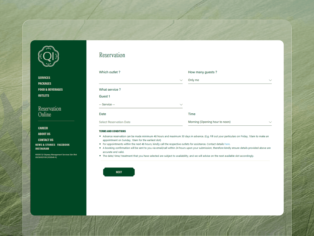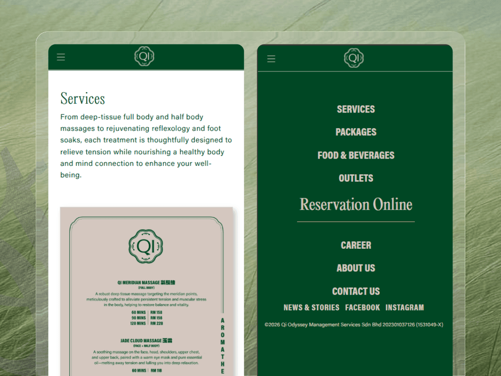 The Qi Odyssey website was designed as a mobile-first digital experience for a modern urban wellness brand blending traditional Chinese reflexology with a contemporary spa environment. Understanding that the majority of spa customers in Malaysia discover and book services via mobile, the project prioritized clarity, speed, and ease of booking on smaller screens while maintaining a calm, premium brand presence. The result is a streamlined, conversion-focused experience that guides users naturally from discovery to reservation.