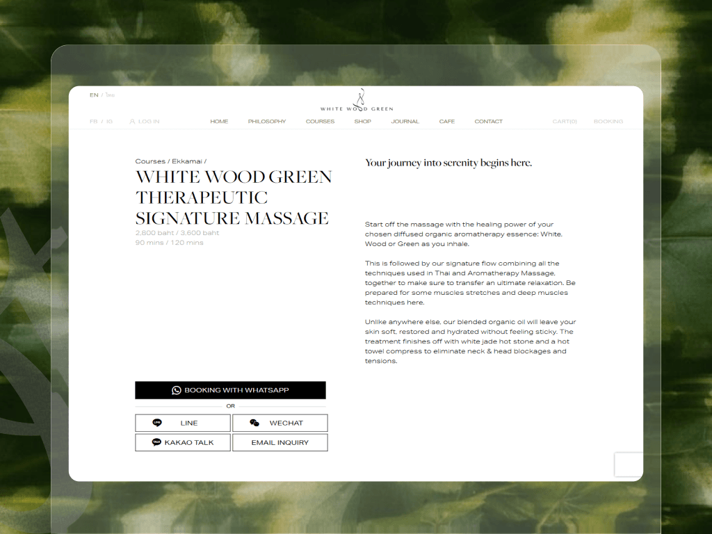 White Wood Green is a nature-inspired wellness brand that blends purity, warmth, and greenery into a holistic spa experience. The brand emphasizes organic care, calm environments, and mindful relaxation, positioning itself as a serene urban sanctuary. For this project, my role focused purely on visual and experience design, translating the brand’s philosophy into a refined digital interface that reflects its organic and tranquil identity.